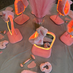 Upgrade your get together to a SPA DAY! Our rental service includes a stunning and unique set up (and take down) for each attending guest. Guests will receive: A light-up mirror, facial roller, gua sha stone, nail file, fluffy hair band & hair scrunchy, all natural lotion (made form shae butter), a silk robe and soft sitting pillows!